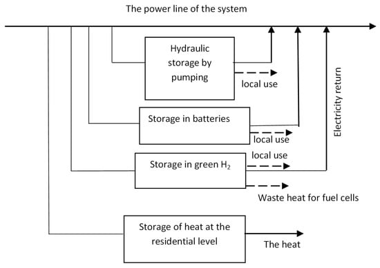 In Figure 1, a synthesis of the main electric energy storage technologies during peak production periods (excess production from renewable sources) is presented. This energy is intended to be reintroduced into the electric system or used in other forms of energy. Energy return can also be replaced with local utilization of electric energy from the storage system. This excess electric energy production will depend on both random opacity levels and seasonality.