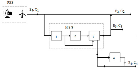 Schematic of the integration system in care: RES—renewable energy sources; HSS—hydrogen storage system; 1—electrolyser; 2—hydrogen storage; 3—fuel cell; 4—heat accumulator; E1—electric energy from renewable sources, in kWh; C1—the cost of electricity produced from renewable sources, in USD/kWh; E2—electric energy delivered to the network, in kWh; C2—the price of electricity delivered to the network, in USD/kWh; E3—electric energy delivered to the local grid network, in kWh; C3—the price of electricity delivered to the local grid network, in USD/kWh; E4—thermal energy delivered to consumers, kWh; C4—the price of thermal energy, in USD/kWh.