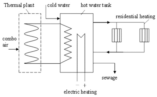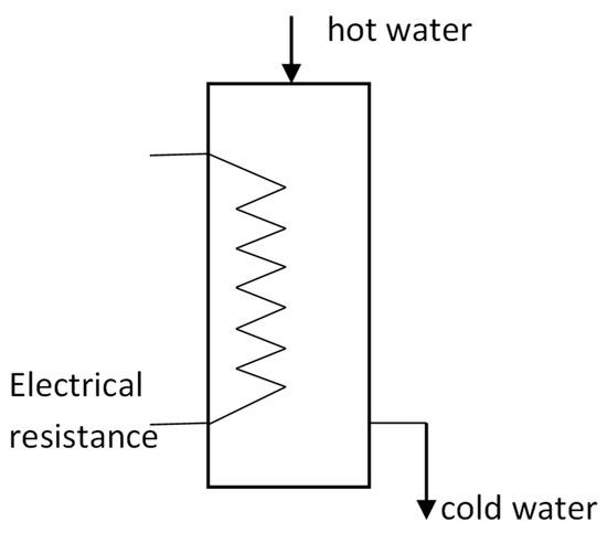 Another possibility of storing electricity in hot water can exist in some residential houses that include individual installations with heating with fossil fuels and which are equipped with a water accumulator of 1000–1500 L. These accumulators will heat the water both from the hot water circuit of the plant and from an electric circuit with a power of 2–5 kW, depending on the value of the supply voltage; see Figure 6.