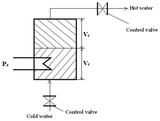 where: is the volume of cold water in ; is the specific heat of cold water, kJ/(kgK); is the density of cold water, ; is the temperature of hot water, ; is the temperature of cold water, ; and τ is the operating time. The total volume of the boiler in is the sum of and , .
