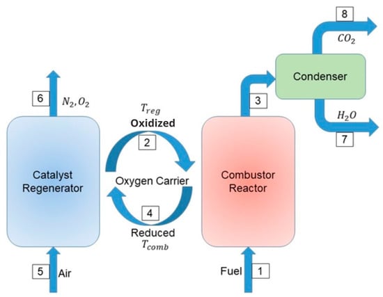 Climate change is a result of the atmospheric increase in greenhouse gases (GHGs), including carbon dioxide (CO2) generated by combustion, threatening human survival on the planet. Notwithstanding, CO2 is harmless and an abundant source of C1 carbon, which has established itself as a substitute for CO in C1 carbon chemistry, with the aim of retaining natural carbon in recycling sources [1]. This notion compels us to suggest the development of CO2 capture/concentration process schemes that require moderate temperature and pressure conditions. One of the main objectives in the development of these processes is the highly efficient use of energy and capture of CO2 with minimal or no energy consumption (energy penalty). Since CO2, generally, should be separated from nitrogen, coming from the air used in the combustion, separation and storage takes up huge amounts of energy [2,3,4]. To solve energy and environmental problems simultaneously, chemical cycle combustion (CLC) has been proposed; the concept of this combustion is completely different from the traditional one. Lewis and Gilliland (1954) originally proposed the concept of employing an oxygen carrier as a catalyst to generate carbon dioxide with high purity. Subsequently, Gaggioli (1983) proposed the same concept to enhance the thermal efficacy of coal-fired power plants. In 1987, Ishida et al. introduced the term Chemical Looping Combustion (CLC) in their thermodynamic study to reduce the loss of exergy that occurred during the process of transforming fuels into thermal energy [5]. The biggest additional cost in a CLC process is the replacement of the carrier. The oxygen carrier must complete certain criteria to demonstrate that it is feasible to use for this process. Among these, the ability to transport oxygen (Roc), having high reactivity in the oxidation and reduction reaction stands out, which will guarantee many redox cycles to the carrier. It is imperative that favorable thermodynamic conditions are present during the conversion of the fuel into CO2 and H2O for the CLC process, or CO and H2 for the reformation in chemical cycles. Coke accumulation must be minimal to prevent airflow in the regeneration reactor from being cut off, drastically reducing complete combustion. CLC was proposed to increase fuel combustion efficiency and generate high-purity CO2 stream. This product could be used to generate high-value products [1]. This work is focused on the compromise between costs of loss of exergy and costs of separation of CO2 from the gaseous emission after combustion.