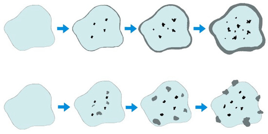 The proposed operating temperature for a reactive CLC system has been limited to 950 ± 8 °C [8,20]. Ilmenite has a particular characteristic, throughout the cycles its performance in the process increases, it is estimated that in the first 100 cycles the “activated” ilmenite will reach its optimum point of operation [18]. In prior studies carried out to the material, it has been found that throughout the process an accumulation of iron is generated on the surface of the carrier while the titanium present in the oxides within the ore tends to accumulate in the center, this behavior can be seen in Figure 2 adapted from what has been presented by research groups in the area. Here, the gray specie in the surface correspond to the iron accumulated through the cycles of the ilmenite in the oxidation process. Furthermore, this accumulation is possible in two ways. A homogeneous iron layer or iron islands along the ore. It is important to note that when ilmenite is exposed to these temperatures, the system can be considered free of water, so the water present will be given by the reaction with the syngas.