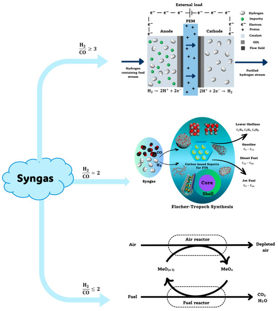 If the syngas obtained from the process exhibits a (H2/CO) ratio greater than three, it is considered a hydrogen-rich gas, and it may be proposed to separate pure hydrogen as a product. On the other hand, if the gas exhibits a (H2/CO) ratio between 2 and 3, the gas can be processed using the Fischer–Tropsch process, which can produce synthetic hydrocarbons. Finally, if this gas exhibits a ratio lower than two, it is considered a lean gas and the separation of its components would be more complex, so coupling to a chemical looping combustion system aiming for a total oxidation becomes an attractive option. This information is exemplified in Figure 3.