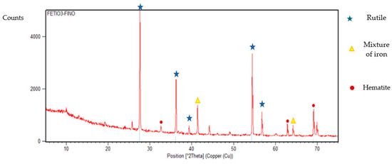 Ilmenite synthesis was conducted using the sol-gel method, using as precursors, nine-hydrated Iron Nitrate (III) and Titanium Butoxide (IV). A hydrolysis solution 16/4 water-ethanol with nitric acid and isopropanol as dispersant medium, which was heated to a temperature of 60 °C and in constant agitation. Once this temperature was reached, titanium butoxide (IV) was added. Working at constant temperature and stirring for an hour, in order to achieve a homogeneous system. After this time, the mixture was cooled to a temperature of 2–3 °C, to proceed to impregnate the hydrolysis solution with the Iron Nitrate (III) by constant drip, maintaining the agitation and temperature of the system, during this period the gel began to form, when it was formed, the agitation was suspended and it was left to age for 24 h at a temperature of −3 °C. After this time, the gel was placed in a watch glass to begin drying for 2 h at 120 °C. A powder with a grain size between 425–710 μm was obtained and calcined at a temperature of 950 °C for two hours, the heating rate was set at 12.9 °C/min. The material obtained was analyzed by X-ray spectroscopy and the following results were obtained (Figure 4).