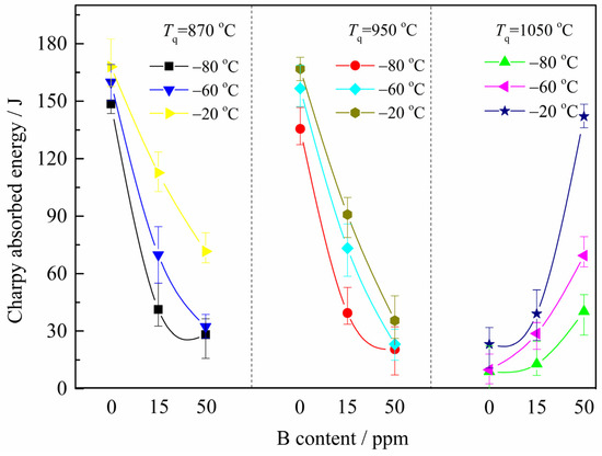 (1) When the steels were quenched at a relatively low Tq, e.g., 870 °C and 950 °C, the average Charpy absorbed energy tested at −80 to −20 °C decreased significantly with an increasing B content from 0 to 50 ppm, but it increased conversely when the steels were quenched at a higher Tq of 1050 °C.