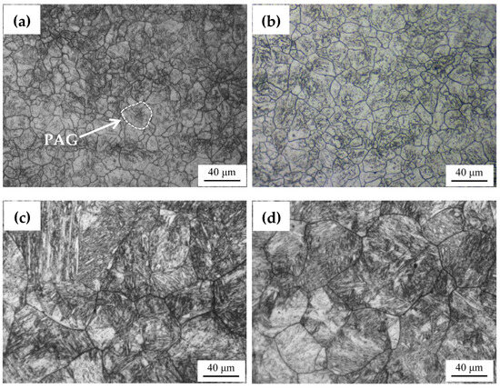 Typical observations of the PAG in the as-quenched (a) 0B-870, (b) 50B-870, (c) 0B-1050, and (d) 50B-1050 specimens.