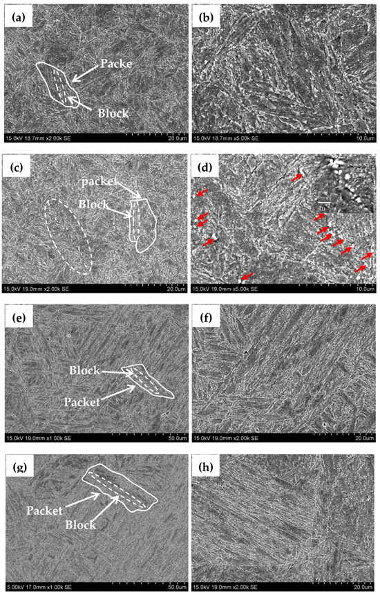 Typical SEM observations of the martensitic packet in the as-tempered (a,b) 0B-870, (c,d) 50B-870, (e,f) 0B-1050, and (g,h) 50B-1050 specimens with different magnifications.