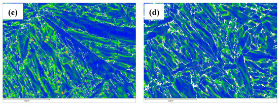 The grain boundary misorientation angle (GBMA) may play a significant role in controlling the impact crack propagation [30]. Therefore, the GBMA distributions of the microstructure were also analyzed by EBSD and the density of the HAGBs, which were defined as GBs with misorientation angles higher than 15°, DGBMA≥15°, for each specimen was quantified from the kernel average misorientation maps, as shown in Figure 5 and as summarized in Table 2. As this table shows, the DGBMA≥15° changed slightly from 1.16 μm−1 to 1.18 μm−1 with an increasing B content under the Tq of 870 °C but increased obviously from 0.87 μm−1 to 0.97 μm−1 under the Tq of 1050 °C. Additionally, as the temperature increased, the overall DGBMA≥15° showed a decreasing trend.