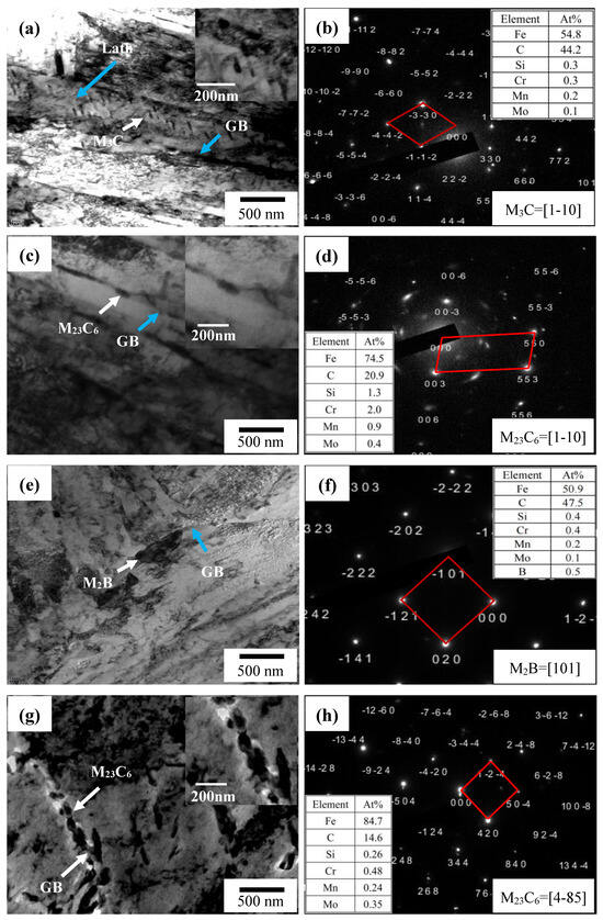 Microstructural investigations were carried out in more detail on the as-tempered 0B-870, 50B-870, 0B-1050, and 50B-1050 specimens by using TEM. Figure 6a–d show a bright field image, the corresponding selected area electron diffraction (SAED) patterns, and the energy disperse spectroscopy (EDS) results of the 0B-870 specimen. The figure shows that numerous short rod-like precipitates were uniformly distributed in the matrix grains, as marked by the white arrows. These precipitates, which are commonly found in TEM analysis of CrMo steel after QT heat treatment, were identified as M3C through the Miller Index of the SAED pattern in Figure 6b. M3C was considered to be transformed from ε-carbides, which were often found in the same martensite lath/plate at an angle of about 60° to the phase boundary and formed in the self-tempering process based on previous research [31]. The average equivalent size dpi and volume fraction fi of the precipitated particles in the matrix grains of each steel specimen were estimated. They are shown in Table 2, which indicates that with the Tq increasing to 1050 °C for 0B steel, the size changed little but the volume fraction of the precipitates in the matrix grains slightly increased. According to the thorough study by Morito and Hutchinson [32], the relationship between the dislocation density (ρ) and carbon concentration (wt.%) in martensite can be expressed by the following equation: