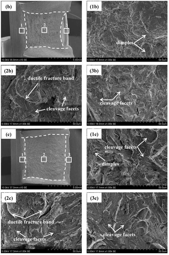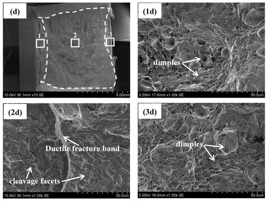 The impact fracture surfaces of the 0B-870, 50B-870, 0B-1050, and 50B-1050 specimens tested at −60 °C were observed using an SEM and are shown in Figure 7. The fracture surface for each specimen can be divided into three parts: (1) the fibrous zone of stable crack propagation, (2) the unstable crack propagation zone, and (3) the shear-lip zone of arrested crack propagation. High-magnification views of these three parts for each specimen correspond to Figure 7(a–3a,b–3b,c–3c,d–3d). Figure 7a shows that the ductile dimpled fractures dominated the fracture regions for the impact fracture surface of the 0B-870 specimen. Figure 7(2b,3b) show the impact fracture surface of the 50B-870 specimen; the dimples were replaced by much more significant river patterns or tongues, dividing the fracture surface into several large areas, which were much smoother and flatter, with little roughness. Moreover, the unstable crack propagation zone occupied most of the fracture surface, as indicated in Figure 7b. Moreover, it can be seen from a comparison of Figure 6a,c that the unstable crack propagation zone expanded and the fibrous zone shrank with the Tq increasing from 870 °C to 1050 °C for the steel without B. The impact fracture surfaces of the steel with 50 ppm B addition under an identical Tq of 1050 °C are shown in Figure 6d. It illustrates that the brittle fracture zones were dominated by high-density river-like patterns and tear ridges with small dimples. However, the sizes of the cleavage facets were smaller and the ductile fracture bands between the junctions of the cleavage facets that were considered as the main energy-absorbing mechanism in the crack propagation process were wider, compared with those of 0B-1050 [36].
