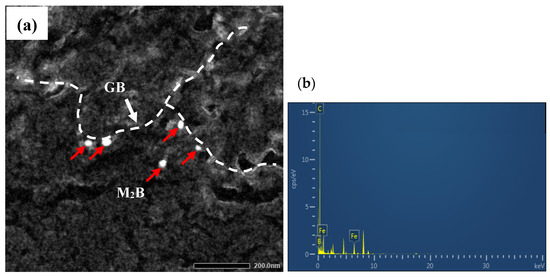 The SEM micrographs of the as-quenched steels with varying B content under different Tq are shown in Figure 8. It is clear that the lath martensite composed the matrix of the whole quenched structure. However, it is worth noting that, for the 50B-870 specimen, discontinuous chains of coarse particles were mainly distributed on the PAG boundaries, which were similar to those in the as-tempered specimen. It can therefore be inferred that the coarse particle identified as M2B in the as-tempered specimen (Figure 6e) was a residue from the quenching process. Additionally, as shown in Figure 2 and Table 2, the PAG of the 50B steel was refined at a Tq of 1050 °C compared with the 0B steel, which was probably related to the fine particles precipitated during the quenching process, while, due to the limited resolution and magnification of the SEM technique, carbon extraction replicas were used for the TEM examination to further confirm our speculations. The TEM micrograph and EDS results of the as-quenched 50B-1050 specimen are presented in Figure 9. It shows many spherical-like particles of around 50 nm distributed near the dimly discernible GBs, as shown in Figure 9a. The main components of the particles were Fe and B, and the higher carbon atomic signal mainly came from the carbon film. Therefore, it can be determined that the precipitated particles (marked by red arrows in the figure) were most likely M2B (Fe2B).