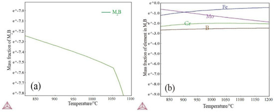 Thermodynamic calculation results: the precipitate of M2B in the 50B-1050 specimen (a) and the compositions of M2B (b).