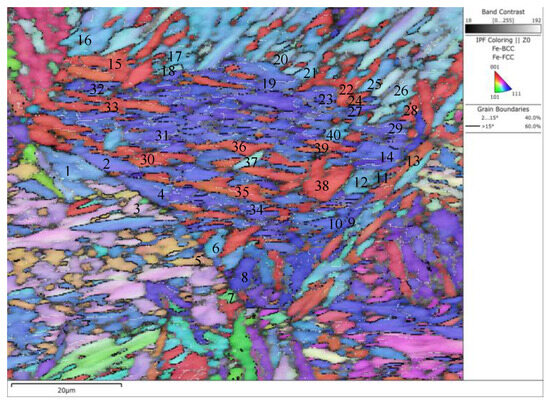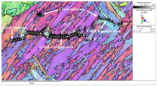 Based on the speculations mentioned above, the corresponding misorientation angles between the grains adjacent to the crack in Figure 11 were analyzed with EBSD and are shown Table 4. The LAGBs/HAGBs were generally defined as GBs with misorientation angles of 2–15°/>15°, as indicated by the white/black line. It can be seen that microcrack A (B) propagated unimpededly through the LAGBs within the grains, e.g., 1–7 and 9, indicating that the LAGBs could not hinder the propagation of the impact crack. In contrast, microcrack A (B) changed direction when it came across the HAGBs of the grains, e.g., 1 and 2 (6 and 7), and was finally arrested at the HAGBs of grains 7 and 8 (9 and 10). Hence, the higher the DGBMA≥15° of the microstructure, the more the crack deviated and the higher the impact toughness. Furthermore, the block could be the minimum structure unit controlling crack propagation.