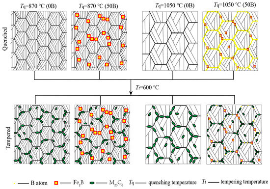 Schematic illustration showing the effect of the Tq on the microstructure evolution of steels with a varying B content.