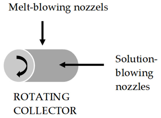 The collector was 90 cm long and 10 cm in diameter. It was covered with the base material (made of polypropylene, 50 g/m2, GF AGRO, GardenFlora, Bydgoszcz, Poland) (90 cm × 31.4 cm) and rotated at a speed of 300 rpm. The distance of the solution-blowing nozzles from the collector was 37 cm. The solution-blowing and melt-blowing nozzles setting method is shown in Figure 3. Each time, the same volume of polymers (PLA and PP) was used to create the filtration structure.