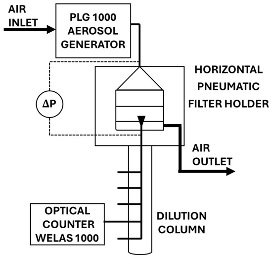The modular MFP 1000 HEPA test bench (PALAS GmbH, Karlsruhe, Germany) was used to perform a DEHS (di-ethyl-hexyl-sebacat) (Sigma-Aldrich, Poznań, Poland) oil mist filtration experiment in a range of droplet diameters from 0.2 μm to 2 μm. The scheme of the test bench is presented in Figure 4. The aerosol generator used to produce submicrometric and micrometric droplets was a PLG1000 (PALAS GmbH, Karlsruhe, Germany). The aerosols were fed directly to the filtration chamber and then through the dilution column to the optical particle counter (light-scattering spectrometer system—WELAS digital 1000 [PALAS GmbH, Karlsruhe, Germany]).