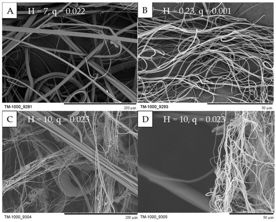 SEM photo of obtained filtration structures: (A) PP fibres, (B) PLA fibres, (C) mixed structure, (D) multilayer structure; the thickness of the structures (H, mm) and the surface density (q, g/cm2) were marked in the figure.