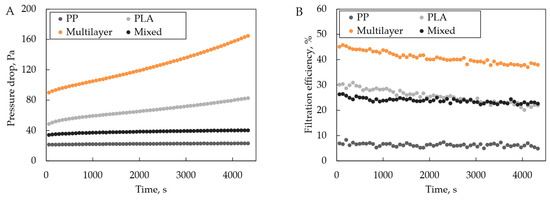 Analysing the value of the quality factor during the loading process, one can also notice significant differences in its course for the tested structures (Figure 12). It is worth noting that at the end of the loading study, the quality factor of pure PLA and multilayer structure was at the comparable level to the quality factor of PP structure. The high filtration efficiency of those structures and high flow resistance, which at the end of the loading process is almost twice as high as the initial one, leads to low Qf values.