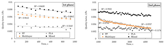 Two periods are visible in the curves, showing the change in the Qf value over time. The Qf value decreases rapidly in the first phase (up to approximately 1000 s). In the second phase, the decline in the Qf value is slower. Figure 13 shows the course of Qf in both phases and the adjustment to the course of a linear function. The accuracy of function fitting for Qf waveforms for structures containing nanofibres (PLA, multilayer, and mixed) is satisfactory. Table 3 lists the values of the slope coefficients of linear functions describing the Qf course during the loading study. The slope coefficient shows the Qf value reduction rate during the loading process. The smaller the slope coefficient, the slower the Qf will decrease over time.