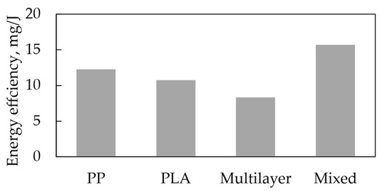 A filter structure with low Qf will consume more energy during operation. By dividing the mass of DEHS retained in the filtration structure by the power needed for the filter operation, determined as the multiplication of time, flow and pressure drop, it was calculated the droplets mass the filter would retain using 1 J of energy [8]. The results are summarised in Figure 14. As expected, the most energy-efficient filter is a mixed structure. It retains nearly 15.70 mg of DEHS using 1 J, while the highly efficient multilayer structure retains only 8.36 mg. However, it is worth remembering that low energy consumption cannot be the only criterion for assessing a filtration structure because low-efficiency filters (PP structure) rank high in such a ranking.