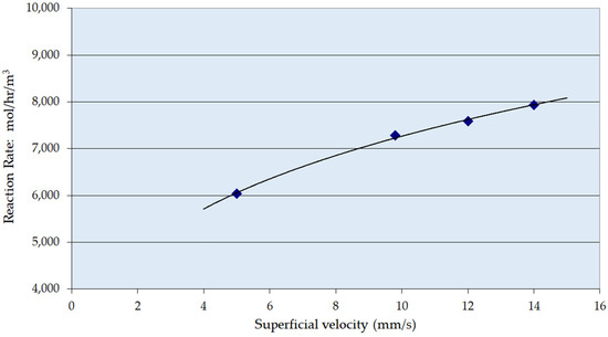 Figure 2 shows the zero-order reaction rate for the hydrogenation of resorcinol over the Ni/Al2O3 catalyst as a function of liquid superficial velocity. The rate of reaction increased as the superficial velocity was increased from 7 mm s−1 up to 14 mm s−1. It is expected that the trickle-to-pulse regime transition for this catalyst would occur at 8–10 mm s−1 for this size and type of extrudate [62,63,64]. The experimental range thus spans the flow regime transition.