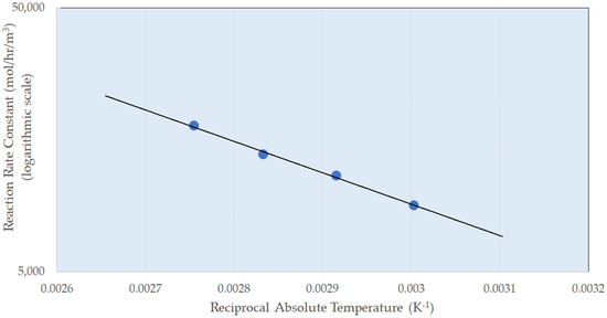 Figure 4 shows an Arrhenius-type plot, where the natural logarithm of the reaction rate has been plotted against 1/Temperature (K) to determine an activation energy (Ea) for hydrogenation. The gradient of the line is −Ea·R−1, where R is the gas constant, which gives rise to an activation energy of 22 kJ mol−1. This value of 22 kJ mol−1 is quite low for hydrogenation and would commonly be used to infer a mass transfer limitation. A low activation energy was observed for this reaction in autoclave studies over a Rh/Al2O3 catalyst [52]; whereas, when the reaction was performed in a more structured system (capillary flow), the value was higher, indicating kinetic control consistent with the high rates of mass transport and mixing for multiphase flow in more structured reactors. This is consistent with the first-order pressure dependency observed above.