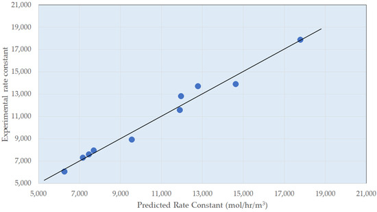 A multi-variate analysis of the experimental data can be completed to obtain a design correlation for the zero-order portion of the reaction below, for which the fitting parity plot is shown in Figure 5.
