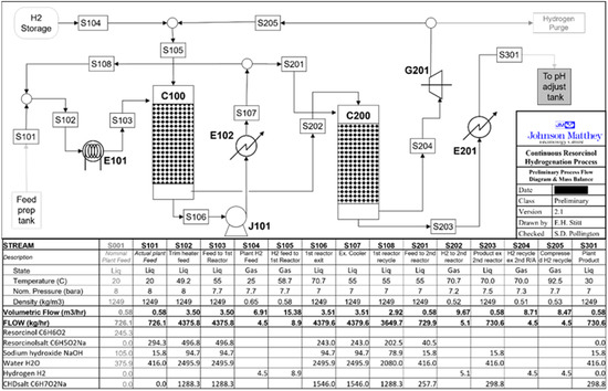 As noted above, there are two hydrogenation reactors; the first one (C100) is designed to convert 85% of resorcinol at an inlet temperature of 333 K and a nominal design pressure of 7 barg as described above. The second reactor (C200) is designed to convert the remaining resorcinol at 333 K at a nominal design pressure of 7 barg. The feed composition of resorcinol, sodium hydroxide, and water is fed from a preparation feed tank, which may be available from existing vessels. The feed preparation tank will require moderate agitation and may require jacketing due to heat generation from the addition of caustic materials to water (not accounted for). The hydrogen gas is fed from a hydrogen storage vessel.