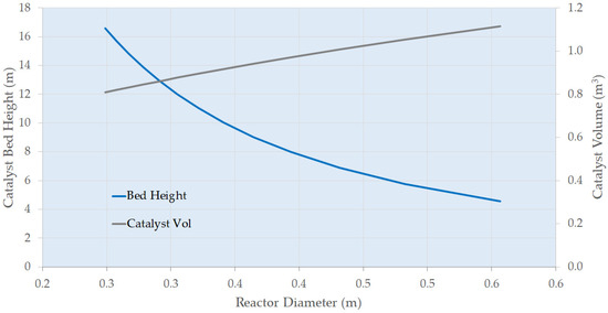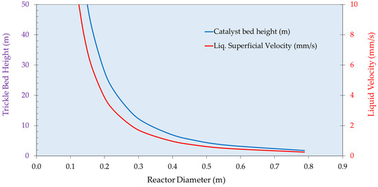 Trickle beds have been in widespread use in the oil refining and petrochemical industries for over 100 years where established testing, scale-up, and design methods are well established. The test reactor, typically 10–40 mm in diameter and up to 1 m in length, is filled “full” of catalyst pellets/extrudate particles and the interstitial voids are filled with inert fine particles (say 50–100 micron SiC particles) [35,36]. This moves the packed voidage to a first approximation from 0.4 to 0.16. The fine particles also dominate the structure of the two-phase flow, leading to an increase in liquid hold-up and thus longer liquid residence times [37]. This essentially allows the test reactor to be operated at design liquid hourly space velocities and thus allows testing on a once-through integral reactor basis. Scale-up and design is based on the arising data and, significantly, on prior knowledge including kinetic and hydrodynamic models as well as data from existing units.