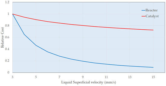 To obtain more realistic costings, the sizes and duties of the main plant items (reactors, heat exchangers, pumps, and compressors) need to be identified based on the experimental data. This estimate would be for a unit responsible for the continuous hydrogenation of resorcinol, producing 2000 metric tons per annum of product. Figure 7 shows how the preliminary trickle bed reactor (first hydrogenation vessel C100) can be designed. The catalyst volume required is 2.6 m3 for a reactor diameter of 0.4 m, giving a bed height of 20 m. While data generated to date indicate the absence of acute deactivation and this commercial catalyst generally exhibits long lifetimes, there are no specific data presently on chronic effects. This volume therefore includes an arbitrary but experiential 20% design margin to account for catalyst deactivation. Increasing the diameter of the reactor decreases the height of the catalyst bed but more catalyst volume is required due to the dependence on liquid mass velocity. Figure 8 shows the impact of superficial velocity on the relative cost of the reactor. Increasing superficial velocity lowers the cost of the reactor and catalyst costing, which is a positive result considering that increasing superficial velocity increases the rate of the reaction (Figure 2). Figure 9 shows the impact of superficial velocity on the polishing reactor (second hydrogenation reactor C200). Increasing the reactor’s diameter means that reduced trickle bed height and superficial velocities are required for a realistic reactor design. Operation of the polishing reactor (C200) implies that low superficial velocities are required. While a small diameter extrudate may ostensibly be beneficial for reasons related largely to internal mass transfer mitigation in this operating mode, the desired solution in the present study was for an established commercial catalyst. Therefore, this was not taken into consideration.