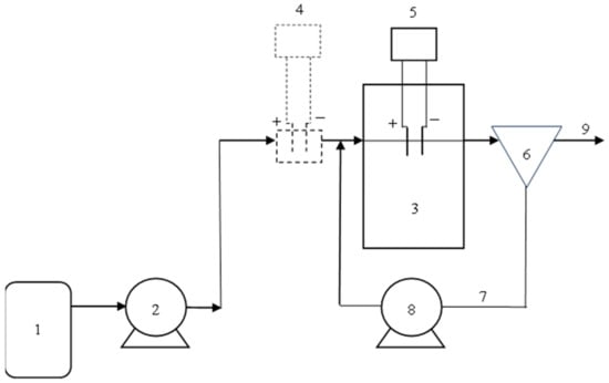 Scheme of laboratory model with electrolysis 1—stock solution (synthetic wastewater), 2—peristaltic pump, 3—activated sludge tank, 4—immersed electrodes with voltage source (alternative placement in separate tank), 5—immersed electrodes with voltage source (placement in activation), 6—sedimentation tank, 7—returned sludge, 8—peristaltic pump for sludge recirculation, 9—wastewater effluent.