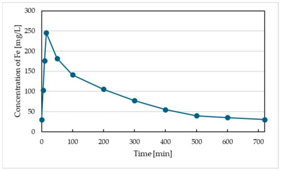 In Reactor I, the influence of electrolysis placed before the activation tank was investigated. Iron electrodes were submerged into a 0.3-L tank and spaced 5 cm apart. Electrolysis was activated twice a day for 15 min each time. Figure 2 illustrates the evolution of iron concentration in the electrolysis tank and the dosing of iron into the activation tank. It can be seen that this dosing is not steady, and after 15 min of iron concentration increase due to electrolysis, iron is gradually washed out by the flow of wastewater into the activation tank. The unevenness of iron concentration over the hydraulic retention time in the activation process was not reflected in the evolution of iron concentration in the effluent from the activation or the sedimentation tank (see Figure 3). Electrolysis was started on the 20th day of reactor operation. In Figure 3, we can observe an immediate increase in iron concentration at the outlet of Reactor III. The concentration of Fe in the activated sludge gradually increased and stabilized at around 950 mg/L. The concentration of Fe at the outlet of Reactor III was below 2 mg/L at the end of the reactor monitoring (Figure 3). The impact of electrolysis on parameters such as COD and P-PO4 in the effluent from the laboratory model was primarily monitored, assuming that these parameters might be affected. Additionally, the influence on sludge sedimentation properties was studied.