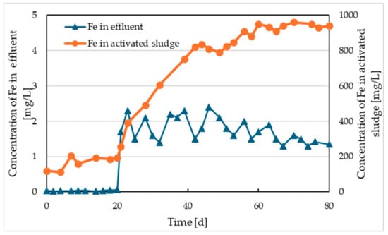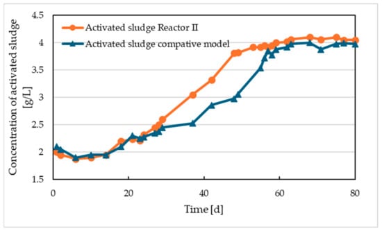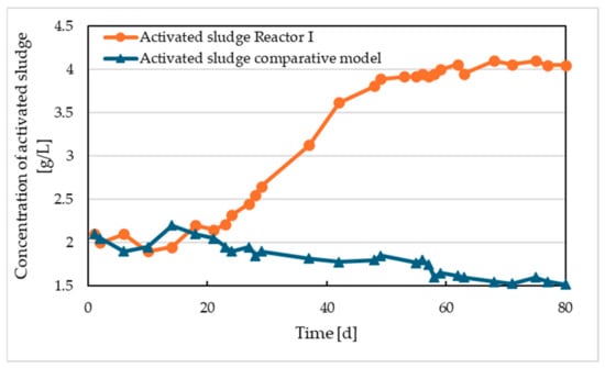 However, concentrations of P-PO4 were different. While the average concentration of P-PO4 in the comparative model was 8.9 mg/L (Figure 5), in the model with separate electrolysis, this concentration was 9.4 mg/L before the electrolysis was started, and it dropped to values ranging from 0.3 to 1.07 mg/L with an average of 0.52 mg/L immediately after the electrolysis was initiated (Figure 4). In the comparative model, the decrease in phosphate concentration from 15 mg/L to an average value of 8.9 mg/L was mainly due to assimilation into the newly formed activated sludge. In the model with electrolysis, more than 96.5% efficiency in P-PO4 removal was due to both assimilation and precipitation of phosphates by iron released during the electrolysis from the iron electrode. The average concentration of P-PO4 after the electrolysis was initiated was 0.52 mg/L. The concentrations of iron at the outlet from Reactor I and in its activated sludge are shown in Figure 3. From this figure, phosphate concentrations below 1 mg/L can be seen. However, this does not necessarily imply the optimal amount of released iron for phosphate precipitation. Iron, besides precipitating with phosphorus, also forms Fe(OH)3 precipitates, which become part of the activated sludge. While in the comparative model the initial concentration of activated sludge of 2.1 g/L slightly decreased, reaching 1.52 g/L by the end of operation, it increased to a concentration of 4.05 g/L in Reactor I (Figure 6). Figure 3 shows that iron concentration in the sludge gradually increased, stabilizing at a value of approximately 930 mg/L in the last 20 days of operation. Volatile suspended solids (VSS) content in this sludge was 47%, indicating the accumulation of chemical sludge in the activation tank. By removing excess sludge with a sludge age of 15 days, after approximately 60 days, an equilibrium was reached in iron dissolution by electrolysis, formation of chemical sludge with iron content, and removal and discharge of iron at the outlet of the model. The proportion of activated sludge from the mixture with chemical sludge was 2.4 g, which means that besides the amount of chemical sludge, the amount of activated sludge also slightly increased. Concentration profiles of activated sludge in Reactor I and in the comparative model are shown in Figure 6. Over the entire operating period of the model, approximately 7200 mg of Fe were dissolved, and 6.92 Ah were consumed. These values are derived from the theoretical mass-based electrochemical equivalent of 1041 mg/Ah Fe [], and it represents total electricity consumption of 145.3 Wh at the applied voltage of 21 V.