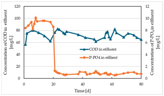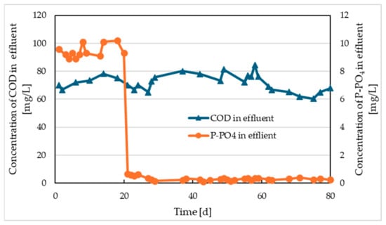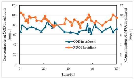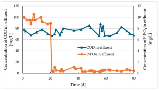 The values of COD at the outlet from Reactor I and the comparative model are shown in Figure 4 and Figure 5, respectively. Output concentrations of P-PO4 are also depicted in the same figures. From the COD trends of both models, it is evident that separate electrolysis does not have a significant impact on the output values. This is mainly due to higher efficiencies of COD removal of electrocoagulation—above 50%, for wastewater with high concentrations of insoluble, especially colloidal, particles and high molecular weight organic substances []. The synthetic wastewater used contained only simple and easily degradable substances (glucose and sodium acetate), and therefore no contribution to COD removal efficiency was observed for the electrocoagulation process. Nevertheless, the average COD removal efficiency in Reactor I was 90.7%, and it was 90.9% in the comparative model.