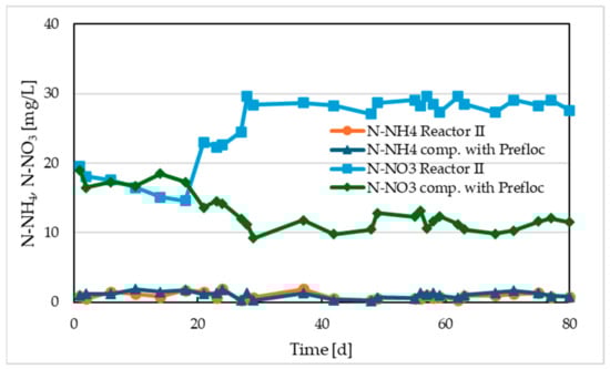 Course of N-NH4 and N-NO3 concentrations in effluent from Reactor II and from the comparative model with Prefloc dosing.