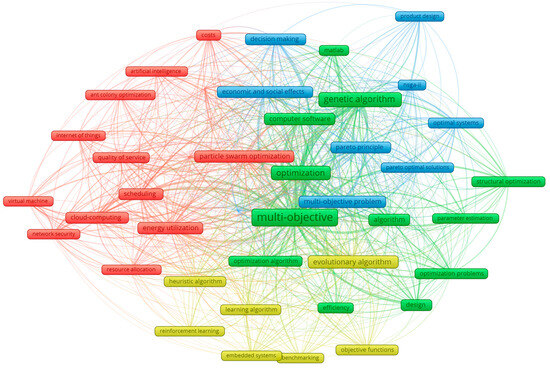 The first cluster (red) focuses on swarm-based algorithms applied in different optimization areas like resource allocation, cloud computing, the Internet of Things, and efficient energy utilization. The keywords belonging to the second cluster (green) gravitate around multi-objective genetic algorithms applied in design space exploration and optimization problems from the industrial engineering domain, using MATLAB as an evaluation platform. The third cluster (blue) contains the keywords specific to Pareto dominance for multi-objective optimization problems with NSGA-II [29] as the main algorithm used in decision-making or for product design with specific constraint problems. Finally, the fourth cluster (yellow) focuses on evolutionary algorithms and other heuristics or learning algorithms for problem solving and optimization, using benchmarking on standard platforms, but this could also be applied in engineering education by simulation and virtual reality environments required by digital twin transition (green and digital). Table 2, Table 3, Table 4 and Table 5 shows the clustering of frequent keywords in that 1769 articles found.