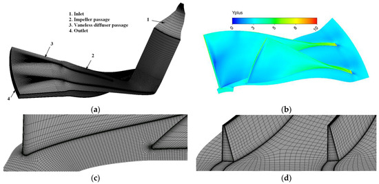 Structural grid of the centrifugal compressor: (a) single-passage structural cells, (b) y+ contour of the blade, (c) mesh details at the leading edge of the blade, (d) mesh details at the trailing edge of the blade.