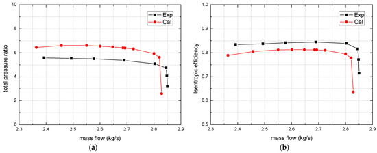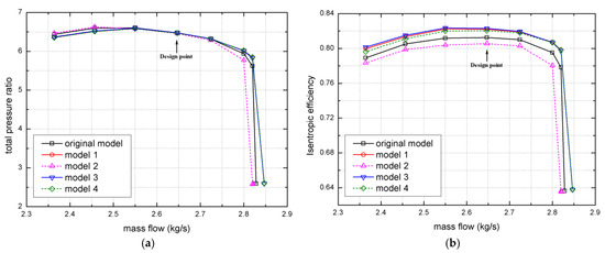 Performance comparison: (a) total pressure ratio—mass flow rate, (b) isentropic efficiency—mass flow rate.