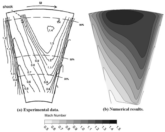 Figure 5 presents a comparison of the Mach number at the impeller inlet for the design condition (Q = 2.55 kg/s), where the Mach number distribution primarily ranged between 0.5 and 1.5. The computed Mach number distribution showed good agreement with the experimental results reported in the literature [24,25]. As shown in Figure 6, at the design condition, the Mach number comparison at the impeller outlet was mainly between 0.4 and 0.8. The suction and pressure sides of the main blade, near the splitter blade, exhibited distinct Mach number distribution characteristics, which were consistent with experimental results found in the literature. In summary, the comparison and validation of computational results for both external characteristics and flow field details of the compressor against experimental results demonstrated that the numerical results for external performance and flow details were in good agreement with experimental data, indicating the validity of the numerical solution method used in this study.