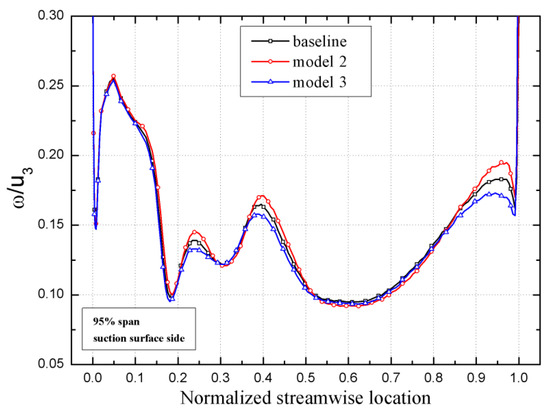 The comparison diagram shown in Figure 10 depicts a dimensionless relative velocity distribution on the main blade high-suction surface of 95%. The differences in relative velocity distribution among the three models were mainly concentrated within the flow direction range of 0.2–0.5 and 0.9–1. The relative velocity fluctuated within a specific range, with the largest difference occurring at wave peaks. Model 2 exhibited the highest level of fluctuation, while model 3 showed minimal fluctuation. In general, model 3 demonstrated a more evenly distributed relative velocity along the blade passage.
