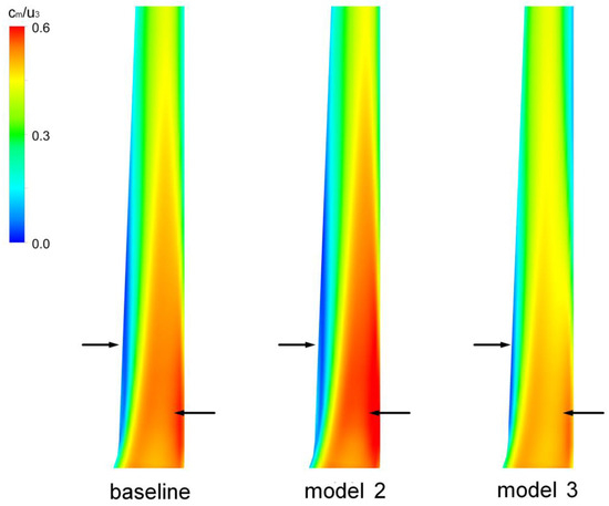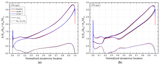 Figure 11 shows the non-dimensional load distribution on the main blade surface at 50% and 95% blade height. At a blade height of 50%, all three models exhibited a similar trend in load distribution, with the pressure difference between the two sides of the blade gradually increasing towards its maximum value in the downstream region. However, at a blade height of 95%, noticeable differences in load distribution were observed in the downstream region. Model 3 showed the smallest pressure difference between both sides of the blade. Additionally, model 3 demonstrated a more gradual attenuation trend for pressure differences near the trailing edge of the blade.
