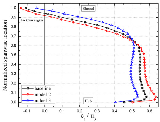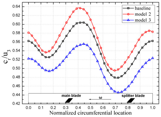 Figure 13 illustrates the distribution of the dimensionless radial velocity (average circumferential mass) at the impeller outlet along the spanwise direction. In the tip clearance region, all three models exhibited a backflow region. However, model 3 exhibited a smaller backflow region with lower backflow speed compared to that of the original model, while model 2 showed the opposite trend. The radial velocity of model 3 experienced a significant increase from 65% to 95% of the blade height, eventually reaching relative stability. Subsequently, the values gradually decreased and became more uniformly distributed in the spanwise direction. As shown in Figure 14, model 3 displayed a narrower fluctuation range in the circumferential direction and an overall more uniform distribution of radial velocity at the impeller outlet. This had a significant impact on flow stability when the fluid entered the vaneless diffuser.