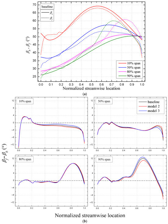 Blade angle and relative flow angle distribution and difference: (a) blade angle and relative flow angle distribution of the baseline along the streamwise location, (b) difference between blade angle and relative flow angle for the three models at different spans (the dashed line is the zero scale line).