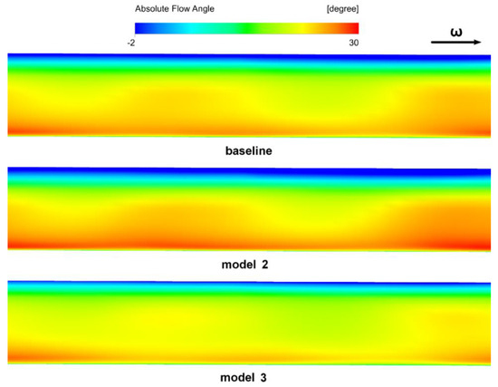 Figure 15a illustrates the distribution of blade angles and relative airflow angles along the flow direction in the original model. The figure shows that the blade angle of the original model had a uniform distribution at different blade heights. In the upstream region of the flow channel, there was a slight disparity between the relative airflow angle and blade angle, primarily noticeable in the lower section (10–50% span) of the blade height. Downstream, there was a significant increase in difference between the relative airflow angle and blade angle for the high blade height (80–90% span). At the outlet of the flow channel, except for a high blade height of 80% span, the discrepancy between the relative airflow angle and blade angle further escalated. The analysis of the variation between the blade angle and relative airflow angle for all three models at each specific blade height, as depicted in Figure 15b, indicated that the disparities primarily manifested within the intermediate to lower regions of the flow channel at a 10% span position. Model 3 demonstrated a minimal difference, indicating greater stability in its flow behavior during this period compared to those of the other models. The differences among all three models rapidly increased near the outlet region of the flow channel. However, model 3 exhibited the least change between its respective values for both angles compared to the other models. The difference among the three models was minimal at a blade height of 80%, while it exhibited significant fluctuations in the middle and downstream regions of the flow channel at a blade height of 90%. The reduction in the discrepancy between the blade angle and relative flow angle in the vicinity of the flow channel outlet of model 3 signified that the bending structure could effectively impede flow separation at said outlet, thereby further impacting efficiency.