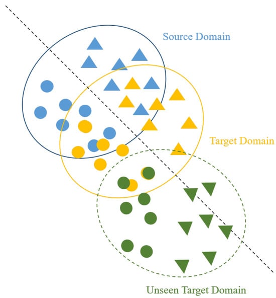 However, most existing fault detection methods are designed for situations where the target domain is visible, meaning the target domain participates in model training. In real industrial manufacturing environments, target domain data may not be available for training. On the one hand, the operational loads of equipment vary greatly, making it impossible to collect complete fault signals for every load condition. On the other hand, suppose a fault occurs the first time the equipment operates under a certain load. In that case, there are no fault signals collected for that load condition at that time. Additionally, some equipment may not be allowed to operate in a faulty state for an extended period, making it impossible to collect complete fault data. In such cases, how to extract universal and effective information from available source domain data and apply it to fault diagnosis in unseen domains is crucial for intelligent diagnostic technologies. In recent years, in response to the issue of fault diagnosis in unseen domain bearings, an increasing number of researchers have proposed fault diagnosis algorithms based on domain generalization networks []. The main idea of domain generalization is to learn from one or multiple source domains and then extract a domain-agnostic model that can be applied to an unseen domain [,]. Chen et al. proposed a generic domain-regressive fault diagnosis model for unseen bearing faults []. Shi et al. developed a domain transferability-based deep domain generalization model for rotary machinery cross-domain fault diagnosis []. Zhao and Shen designed a federated domain generalization framework combining edge computing and cloud computing to realize robust fault diagnosis []. Fan et al. developed a deep mixed domain generalization network to achieve cross-domain fault diagnosis under unseen working conditions or machines []. Wang and Liu proposed a triplet loss-guided adversarial domain adaptation method []. The paper of [] addressed the domain shift issue by concatenating two mini-batches of data from the source and target domains into a single mini-batch and incorporating triplet loss. The commonality between our paper and [] lies in the use of triplet loss to minimize the distribution difference between classes in the feature space. The difference between domain adaptation and domain generalization is shown in Figure 1 and Figure 2. In Figure 1, the model focuses on whether the distribution between the source and target domains can be aligned in a certain space so that the model can classify the target domain correctly but ignores the effect of the model in other unseen domains. In Figure 2, domain generalization is to learn a classification model that can be applied to unseen domains through multiple source domains and pay more attention to the generalization ability of the model.