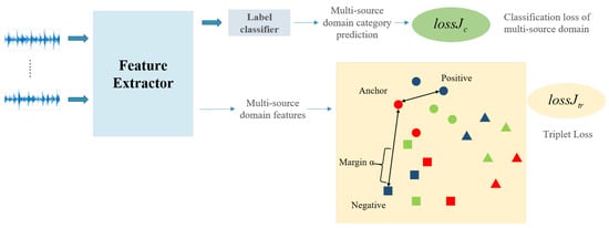 where represents the classification loss of multi-source domains, is a weight coefficient. A larger indicates that the network pays more attention to the triplet loss. represents the triplet loss. and can be represented as Equations (7) and (8):