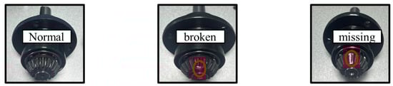 The HUSTgearbox data set is publicly available from Huazhong University of Science and Technology and consists of gearbox data []. Gearbox fault testing was conducted using the Spectra-Quest mechanical fault simulator. There are three health states for the gearbox: Normal, Tooth broken, and Tooth missing, labeled 0, 1, 2. Test rig of HUSTgearbox dataset is shown in Figure 11. Photographs of the failure gears are given in Figure 12. In the experiment, a total of four different operating conditions were set. The operating conditions (rotating speed and load) include: A: 20 Hz and 0.113 Nm; B: 25 Hz and 0.226 Nm; C: 30 Hz and 0.339 Nm; D: 35 Hz and 0.452 Nm. Under each operating condition, 1000 samples were selected for each health state, divided into training and testing sets in an 8:2 ratio. Here, the three health states of conditions A, B, and C were used as the training set, while the three states of condition D were used as the testing set to validate domain generalization effects.
