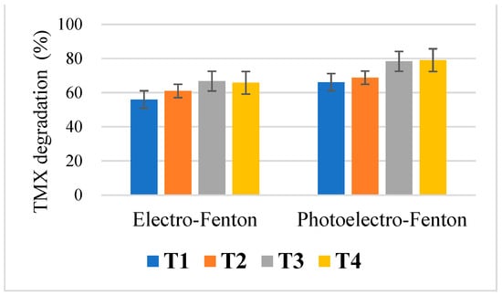 TMX was quantitatively determined via HPLC after 2 h of electrolysis at 50 mA cm−2 under electro-Fenton or photoelectro-Fenton conditions using various concentrations of Fenton’s reagent (T1, T2, T3, and T4). Under the conditions described in the Methodology section, the standard TMX solution (100 mg L−1) exhibited a retention time of 5.5 min, and quantification was performed by comparing the sample’s peak areas against the calibration curve. The percentage of TMX degraded in samples treated using different oxidative processes is shown in Figure 1.