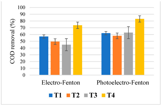 T4 removed the most COD (>70%) in both oxidative processes. The use of UV light favors COD removal, which shows that more oxidants are generated during the oxidative process and that different oxidation mechanisms may be in operation, including the direct photolysis of generated by-products and indirect oxidation by the oxidants [42].