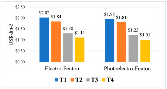Treatment costs range between USD 1.01 and 2.02 dm−3, which are considered satisfactory values, again highlighting that photoelectro-Fenton processes, specifically those involving T4, are slightly more efficient (lower costs). Similar results were obtained in a previous glyphosate oxidation study [35].